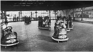 The origin of the Dodgem track is difficult to trace with several claims to its invention and a multitude of patents. However, the most important aspect of the Dodgems is their development into their current format; a controllable bumper car powered through an electrical pick-up linked to the roof nets.