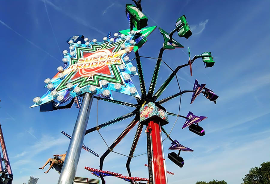 A modernistic twist on the traditional family Paratrooper ride is the Supertrooper. Another fabulous high-octane thrill ride, hop into the umbrella covered carriages and the horizontal framed wheel will spin as it takes you upwards and then tilts when it reaches the top providing high altitude adrenaline fun for all.